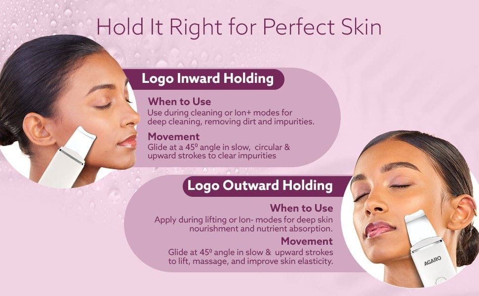 Agaro Skin Scrubber: Professional-grade facial cleansing device designed to gently exfoliate and rejuvenate your complexion. This ultrasonic technology removes dead skin cells, unclogs pores, and enhances product absorption for visibly smoother, brighter skin. Ideal for all skin types, it promotes circulation and reduces the